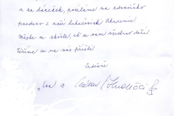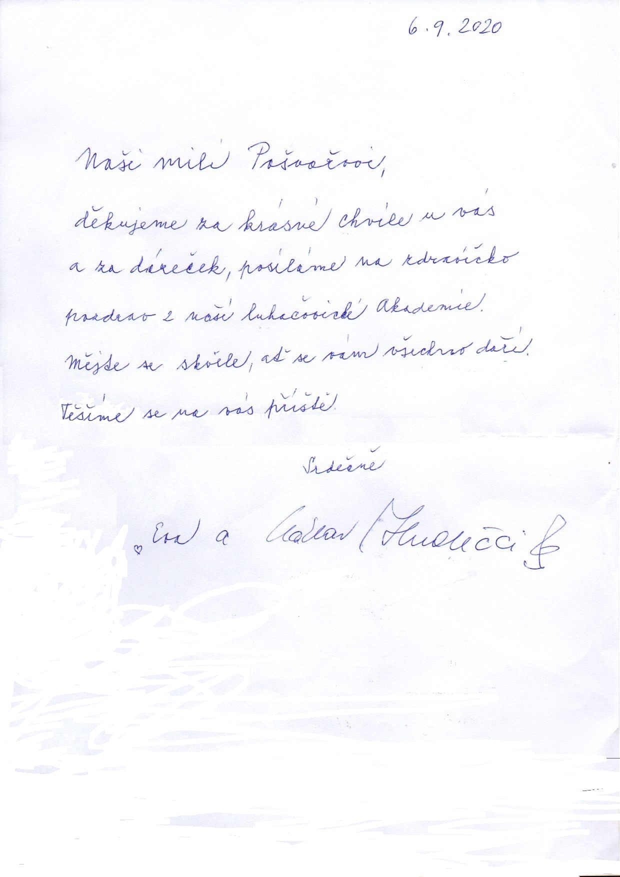Naposledy v září 2020 se již po několikáté v našem hotelu v Třebíči ubytoval světoznámý houslista Václav Hudeček s manželkou Evou. Bohužel, provoz hotelu je nyní v této těžké době velmi časově náročný a tak jsme se s manželi Hudečkovými nemohli tentokrát osobně setkat. Zanechali nám tento krásný pozdrav. Děkujeme!!!