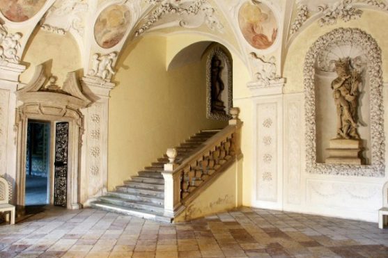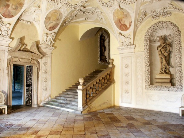Uvnitř je galerie, skýtající za nepříznivého počasí možnost vydatné procházky, zdobena v nikách 44 sochami antických postav nadživotní velikosti a nad pilíři arkád 46 bustami, které vytvořili M. Mandík, M. Zürn a další.